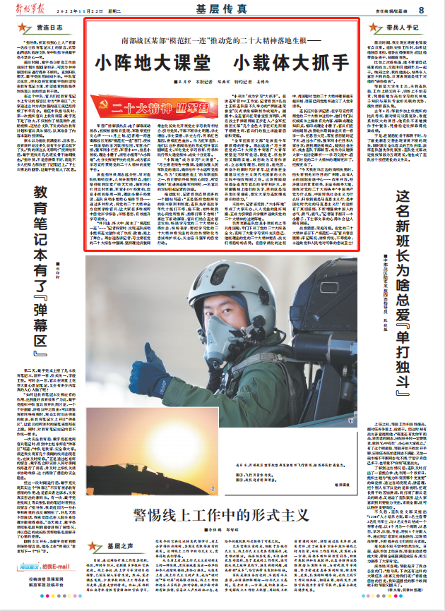 采訪(fǎng)中,記者感受到,“六小陣地”形成了大家來(lái)辦、人人受益的良好局面,正成為引領(lǐng)官兵學(xué)懂弄通做實(shí)黨的二十大精神的過(guò)硬陣地。