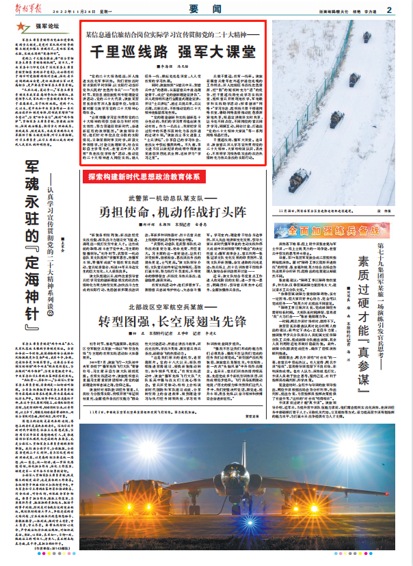 千里巡線路,強軍大課堂。連日來,該旅官兵深入學習宣傳貫徹黨的二十大精神,大家紛紛談認識、表決心,不斷將學習報告煥發(fā)出的政治熱情轉化為練兵備戰(zhàn)的實際行動。