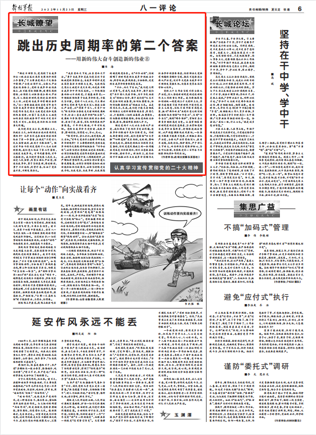 黨的二十大作出堅定不移全面從嚴治黨、深入推進新時代黨的建設(shè)新的偉大工程的重大部署。我們要把思想和行動統(tǒng)一到黨的二十大精神上來,學(xué)懂弄通做實習(xí)近平新時代中國特色社會主義思想,深化習(xí)近平強軍思想武裝,把對“兩個確立”決定性意義的深刻感悟轉(zhuǎn)化為增強“四個意識”、堅定“四個自信”、做到“兩個維護”,貫徹軍委主席負責(zé)制的高度自覺。認真貫徹落實新時代黨的建設(shè)總要求,堅決貫徹黨的自我革命決策部署,持續(xù)推進政治整訓(xùn),以嚴的基調(diào)強化正風(fēng)肅紀,一體推進不敢腐不能腐不想腐,不斷把全面從嚴治黨、全面從嚴治軍引向深入,在看齊追隨、備戰(zhàn)打仗、維護團結(jié)、嚴于律己上下功夫,確保部隊堅定維護核心、堅決聽從指揮,為實現(xiàn)建軍一百年奮斗目標提供紀律和作風(fēng)保證。