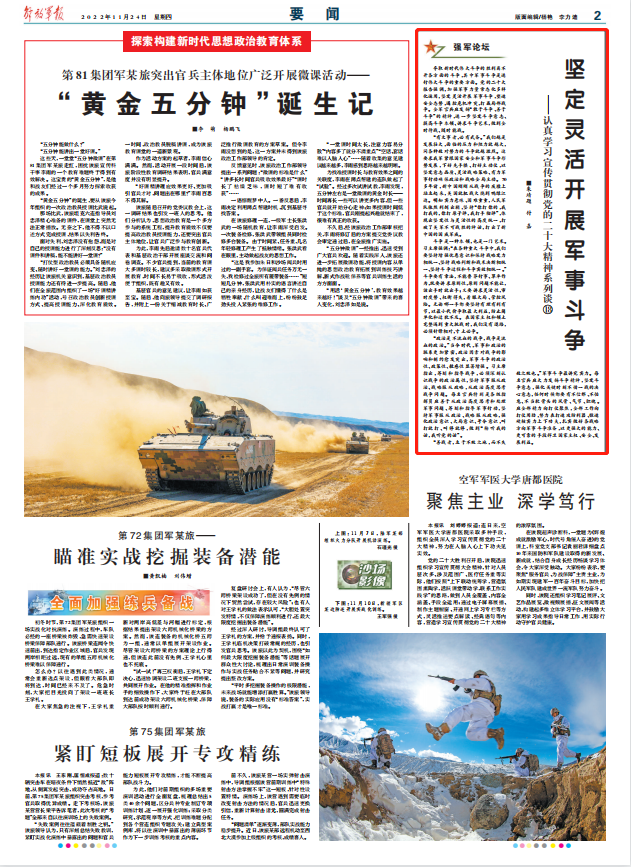 奪取新時代偉大斗爭的勝利離不開各方面的斗爭,其中軍事斗爭是進行偉大斗爭的重要方面。黨的二十大報告強調(diào),加強軍事力量常態(tài)化多樣化運用,堅定靈活開展軍事斗爭,塑造安全態(tài)勢,遏控危機沖突,打贏局部戰(zhàn)爭。全軍官兵應(yīng)發(fā)揚“敢于斗爭、善于斗爭”的精神,進一步堅定斗爭意志、提高斗爭本領(lǐng)、講求斗爭藝術(shù),做到全時待戰(zhàn)、隨時能戰(zhàn)。