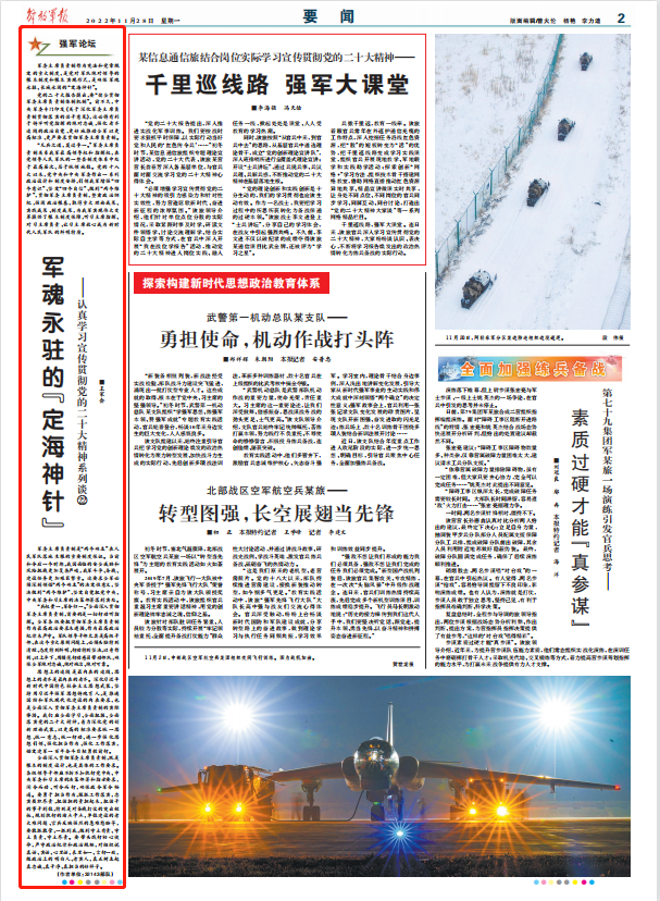 思想上的追隨是最內(nèi)在的追隨,思想上的看齊是最內(nèi)在的看齊。深化習近平新時代中國特色社會主義思想武裝,堅持用習近平強軍思想鑄魂育人,是推進國防和軍隊現(xiàn)代化建設的內(nèi)在要求,也是全面深入貫徹軍委主席負責制的實際舉措。我們應全面學習、全面把握、全面落實黨的二十大精神,著力深化黨的創(chuàng)新理論武裝,以更高的標準要求統(tǒng)一思想、統(tǒng)一意志、統(tǒng)一行動,進一步強化思想引領、強化擔當作為、強化工作落實,錨定建軍一百年奮斗目標勇毅前行。
