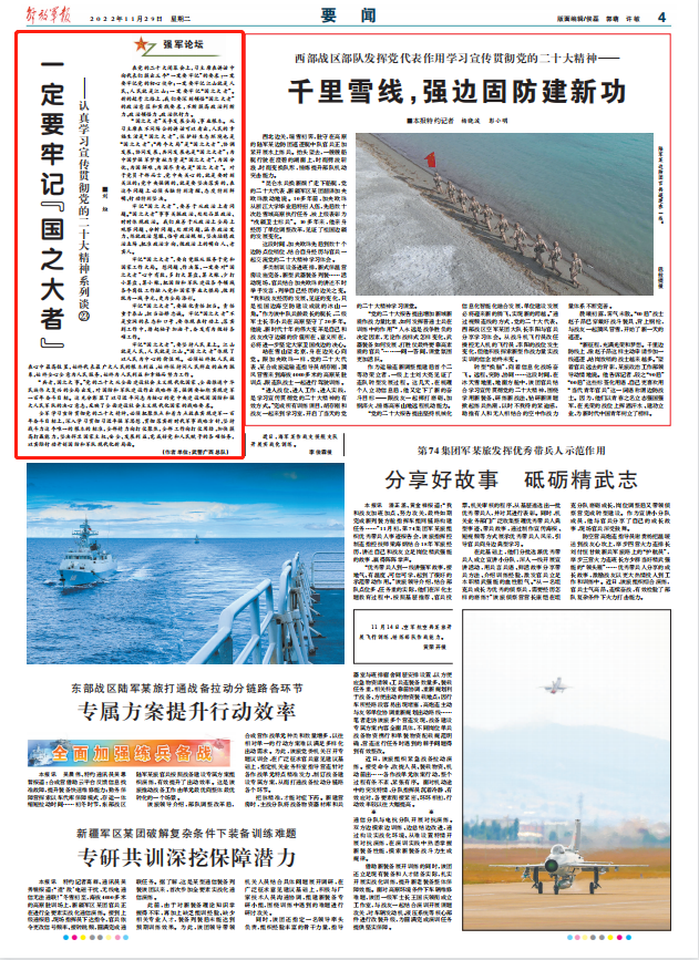 “兵者,國之大事?!秉h的二十大從全面建設(shè)社會主義現(xiàn)代化國家、全面推進(jìn)中華民族偉大復(fù)興的全局出發(fā),對國防和軍隊建設(shè)作出戰(zhàn)略部署,強(qiáng)調(diào)要如期實(shí)現(xiàn)建軍一百年奮斗目標(biāo)。這充分彰顯了以習(xí)近平同志為核心的黨中央建設(shè)鞏固國防和強(qiáng)大人民軍隊的決心意志,反映了全面建設(shè)社會主義現(xiàn)代化國家的戰(zhàn)略要求。