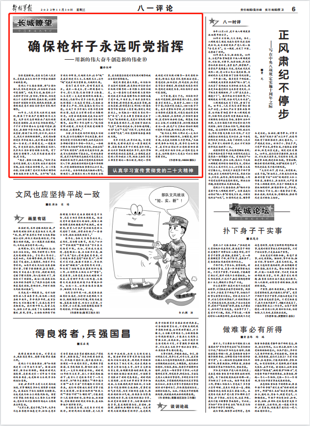 黨的二十大報(bào)告強(qiáng)調(diào),要“全面加強(qiáng)人民軍隊(duì)黨的建設(shè),確保槍桿子永遠(yuǎn)聽黨指揮”。對(duì)我軍來(lái)說(shuō),把黨的二十大精神學(xué)習(xí)好、宣傳好、貫徹好,確保黨的二十大精神在部隊(duì)落地生根,以實(shí)際行動(dòng)開創(chuàng)國(guó)防和軍隊(duì)現(xiàn)代化新局面,首要的就是毫不動(dòng)搖堅(jiān)持黨對(duì)軍隊(duì)絕對(duì)領(lǐng)導(dǎo)。