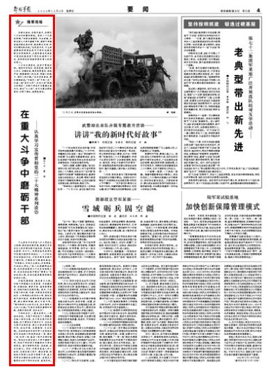 習(xí)主席在中央軍委人才工作會議上強調(diào),要加強實踐歷練,鼓勵引導(dǎo)官兵在火熱軍事實踐中經(jīng)風(fēng)雨、見世面、壯筋骨、長才干。軍事領(lǐng)域是競爭和對抗最為激烈的領(lǐng)域之一,人才的成長沒有捷徑可走,只有在強軍實踐中千錘百煉,才能把自己鍛造成真金。“不登高山,不知天之高也;不臨深溪,不知地之厚也?!庇腥诉@樣精辟地總結(jié):沒在雪域高原上干過怎知缺氧之苦,沒在任務(wù)會戰(zhàn)中啃過“硬骨頭”怎知攻堅之難,沒嘗過基層酸甜苦辣怎知擔(dān)當(dāng)之重。