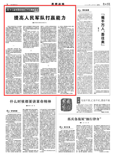 軍事斗爭(zhēng)是進(jìn)行偉大斗爭(zhēng)的重要方面,打贏(yíng)能力是維護(hù)國(guó)家主權(quán)、安全、發(fā)展利益的戰(zhàn)略能力。黨的二十大報(bào)告鮮明指出:“全面加強(qiáng)練兵備戰(zhàn),提高人民軍隊(duì)打贏(yíng)能力。”這是我們黨根據(jù)新時(shí)代人民軍隊(duì)使命任務(wù)和未來(lái)5年我軍建設(shè)的中心任務(wù),對(duì)人民軍隊(duì)提出的戰(zhàn)略要求。在強(qiáng)國(guó)強(qiáng)軍的偉大征程上,人民軍隊(duì)必須始終堅(jiān)持黨對(duì)軍隊(duì)的絕對(duì)領(lǐng)導(dǎo),做到全部心思向打仗聚焦,全部工作向打仗用勁,為全面建設(shè)社會(huì)主義現(xiàn)代化國(guó)家、全面推進(jìn)中華民族偉大復(fù)興提供可靠的保底手段和堅(jiān)強(qiáng)的戰(zhàn)略支撐。