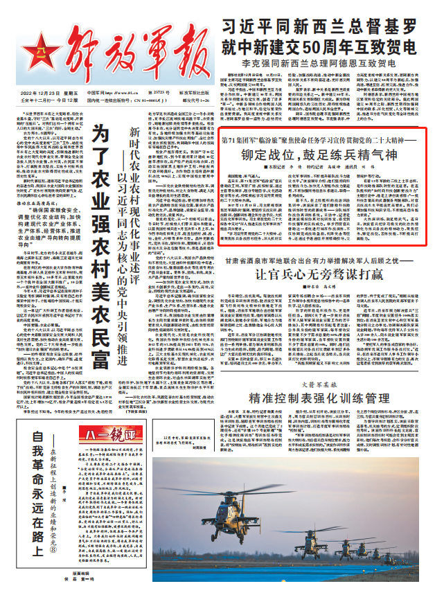 2017年12月13日,習主席視察該集團軍部隊時強調(diào),要堅持實戰(zhàn)實訓、聯(lián)戰(zhàn)聯(lián)訓,創(chuàng)新訓練理念和方法手段,大抓實戰(zhàn)化軍事訓練。習主席在黨的二十大報告中又對“深入推進實戰(zhàn)化軍事訓練”提出具體要求。