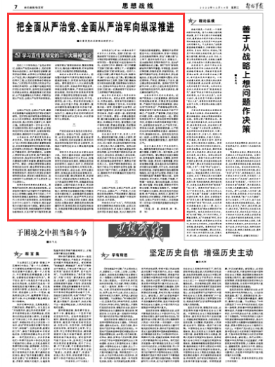 全面從嚴(yán)治黨、全面從嚴(yán)治軍,必須嚴(yán)字當(dāng)頭、全面從嚴(yán)、一嚴(yán)到底,大力發(fā)揚(yáng)自我革命精神,嚴(yán)明紀(jì)律要求、整治歪風(fēng)邪氣、純正政治生態(tài),確保廣大官兵對(duì)黨忠誠(chéng)、永不變質(zhì)。
