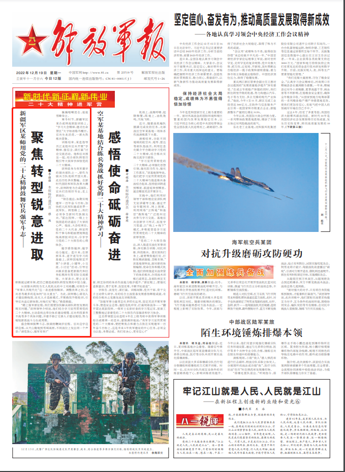 “踏上強軍新征程,我們需要加快解決部隊轉(zhuǎn)型發(fā)展的現(xiàn)實問題?!痹搸燁I(lǐng)導介紹說,他們結(jié)合學習宣傳貫徹黨的二十大精神,主動查找出單位體系建設緩慢、官兵科技素養(yǎng)不高等多個具體問題,并著手修訂完善人才建設規(guī)劃,努力縮短新質(zhì)戰(zhàn)斗力生成周期。