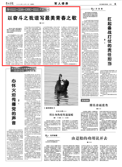 奮斗的青春最美麗,奮斗的人生最充實(shí)。習(xí)主席在黨的二十大報(bào)告中寄語新時(shí)代廣大青年:“要堅(jiān)定不移聽黨話、跟黨走,懷抱夢想又腳踏實(shí)地,敢想敢為又善作善成,立志做有理想、敢擔(dān)當(dāng)、能吃苦、肯奮斗的新時(shí)代好青年”。青年官兵作為部隊(duì)建設(shè)的生力軍,作為強(qiáng)軍夢的主體踐行者,應(yīng)牢記習(xí)主席的殷切囑托,不負(fù)黨和人民期望,把奮斗作為青春的主旋律,積極投身強(qiáng)軍實(shí)踐,以不懈奮斗讓芳華無悔、讓夢想成真。