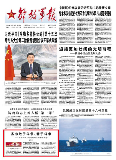 習(xí)主席在黨的二十大報告中強(qiáng)調(diào),全黨同志“務(wù)必敢于斗爭、善于斗爭”。這一要求提醒黨員干部,奮進(jìn)新征程、建功新時代,要堅定斗爭意志、增強(qiáng)斗爭本領(lǐng)、講究斗爭策略,依靠頑強(qiáng)斗爭打開強(qiáng)軍事業(yè)發(fā)展新局面。