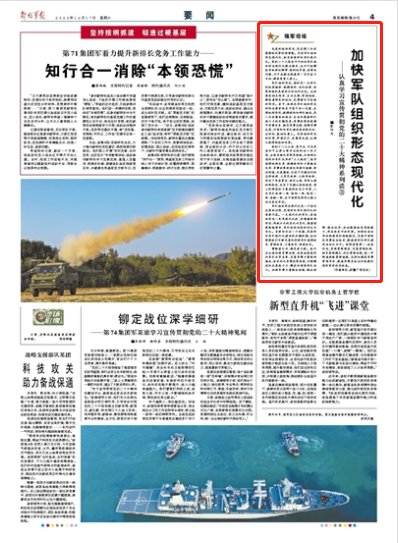 先進(jìn)的組織形態(tài),是發(fā)揮人與武器整體優(yōu)勢(shì)的倍增器。沒有軍隊(duì)組織形態(tài)現(xiàn)代化,就沒有國(guó)防和軍隊(duì)現(xiàn)代化。黨的二十大報(bào)告中對(duì)加快軍隊(duì)組織形態(tài)現(xiàn)代化提出要求,這對(duì)于破解我軍體制性障礙、結(jié)構(gòu)性矛盾、政策性問題,對(duì)于如期實(shí)現(xiàn)建軍一百年奮斗目標(biāo),都具有重大意義。