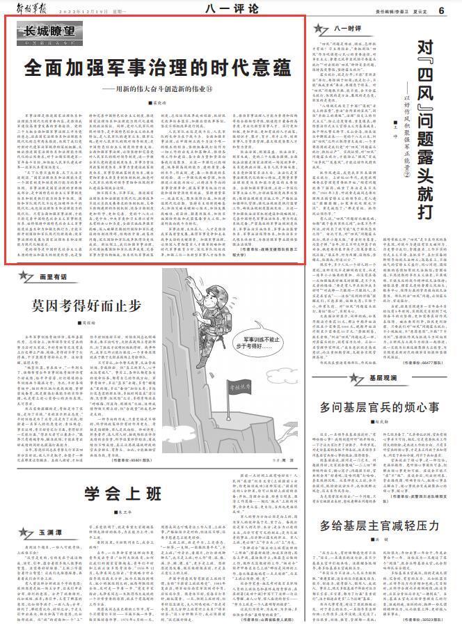 依法治國,則國昌盛。依法治軍,則軍生威。黨的二十大報告強調,全面依法治國是國家治理的一場深刻革命,關系黨執(zhí)政興國,關系人民幸福安康,關系黨和國家長治久安。法治化是軍事治理現(xiàn)代化的核心特征,是衡量軍事治理制度體系和能力建設的主要標準。全面加強軍事治理,應進一步深化軍事立法工作,打好政策制度改革攻堅戰(zhàn);做好法規(guī)制度實施工作,嚴格依法加強部隊管理;強化法規(guī)制度執(zhí)行監(jiān)督工作,確保法規(guī)制度落地見效。應進一步加強依法治軍機制建設和戰(zhàn)略規(guī)劃,完善中國特色軍事法治體系,努力形成系統(tǒng)完備、嚴密高效的軍事法規(guī)制度體系、軍事法治實施體系、軍事法治監(jiān)督體系、軍事法治保障體系,加快治軍方式根本性轉變,為推進強軍事業(yè)提供堅強法治保障。