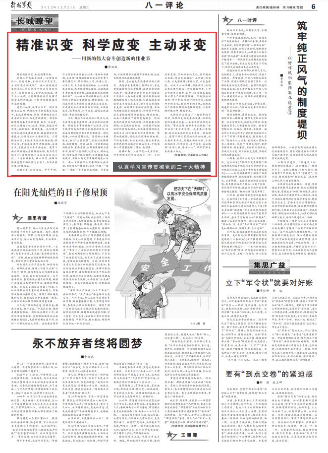 黨的二十大報告指出,“必須堅定信心、銳意進(jìn)取,主動識變應(yīng)變求變,主動防范化解風(fēng)險”。這一重要要求告訴我們,軍隊黨員干部只有領(lǐng)時代先聲、立時代潮頭,善于抓住機(jī)遇、勇于應(yīng)對挑戰(zhàn),才能解答好時代發(fā)展變化帶來的新課題,不斷開創(chuàng)強(qiáng)國強(qiáng)軍事業(yè)新局面。