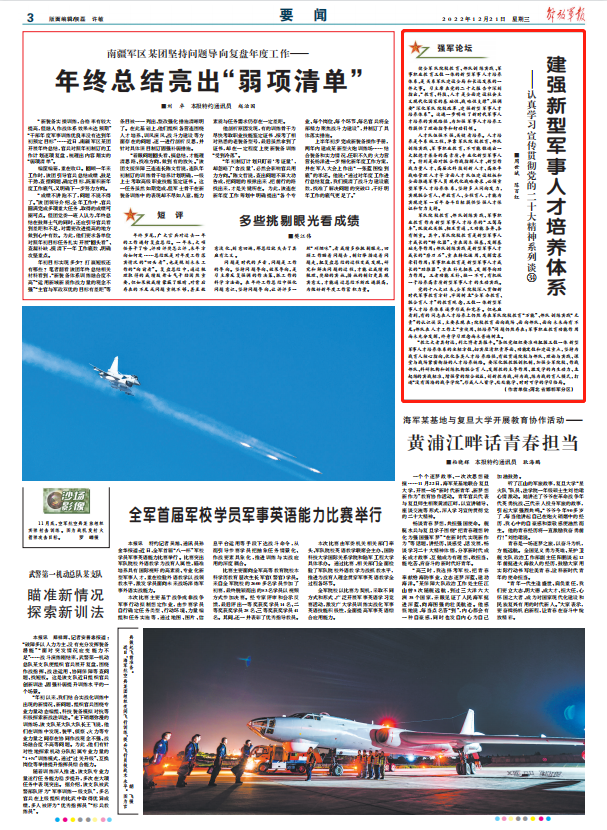 人才隊伍強不強,關鍵看培養(yǎng)。人才培養(yǎng)是個系統(tǒng)工程,單靠軍隊院校教育、部隊訓練實踐、軍事職業(yè)教育,不可能鍛造出一大批德才兼?zhèn)涞母咚刭|、專業(yè)化新型軍事人才。特別是面對聯(lián)合作戰(zhàn)指揮人才、新型作戰(zhàn)力量人才、高層次科技創(chuàng)新人才、高水平戰(zhàn)略管理人才等方面人才隊伍建設短板和全面推進軍事人員現(xiàn)代化戰(zhàn)略要求,必須重塑軍事人才培養(yǎng)體系,堅持多點同向發(fā)力,實現(xiàn)聯(lián)合育人、開放育人、全程育人,才能為實現(xiàn)建軍一百年奮斗目標提供堅強人才保證和智力支持。