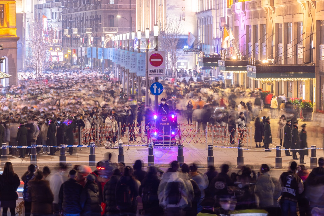 1月1日凌晨,武警上海總隊(duì)機(jī)動(dòng)第一支隊(duì)官兵在南京東路路口以“環(huán)島”形式疏導(dǎo)人流。