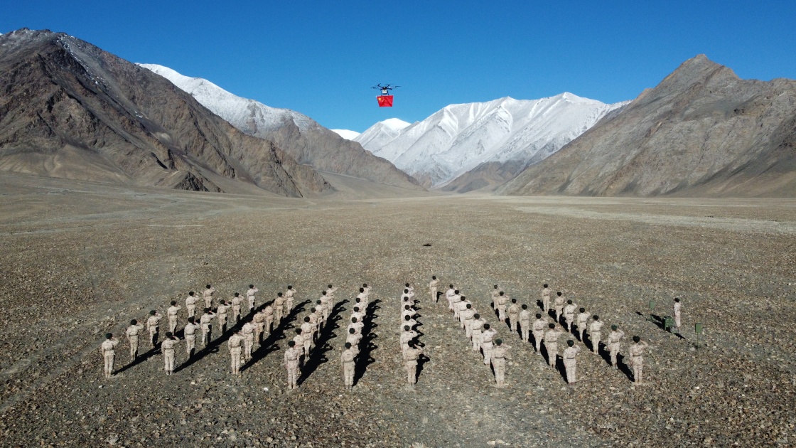1月1日,正在藏北高原無人區(qū)駐訓(xùn)的新疆軍區(qū)某紅軍團(tuán)在雪山腳下組織官兵使用無人機(jī)舉行升國旗儀式。