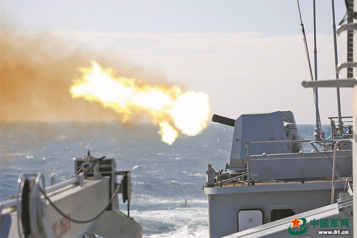 目標(biāo)臨近,官兵果斷施放干擾彈。同時(shí),艦艇各武備系統(tǒng)火力全開。一時(shí)間,海天之間炮聲隆隆,硝煙彌漫。