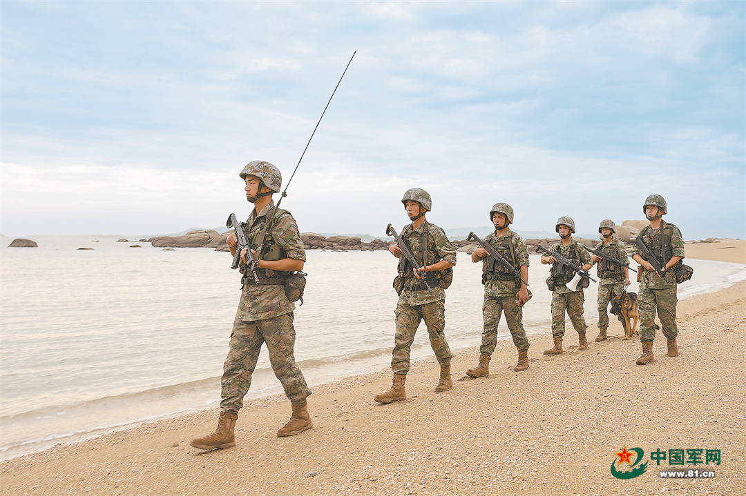 東部戰(zhàn)區(qū)陸軍某海防旅官兵正在巡邏查灘。孫文毅攝