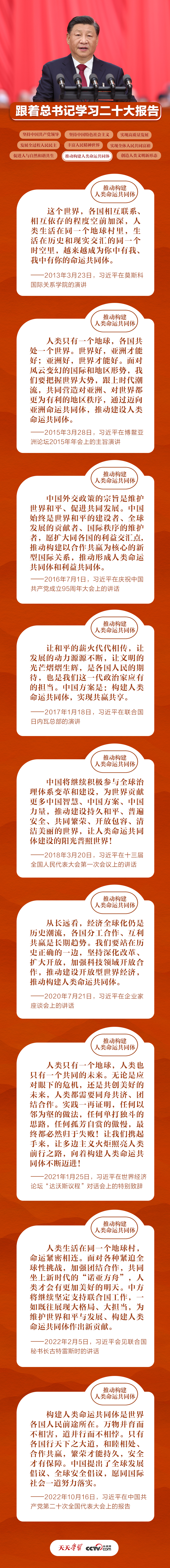 大道之行,天下為公。二十大報(bào)告正式將“推動(dòng)構(gòu)建人類命運(yùn)共同體”列為中國(guó)式現(xiàn)代化的本質(zhì)要求之一。黨的十八大以來(lái),習(xí)近平總書記深刻洞察“世界之變”,科學(xué)回答“世界之問(wèn)”,創(chuàng)造性地提出并不斷豐富發(fā)展構(gòu)建人類命運(yùn)共同體的重要思想,為人類社會(huì)實(shí)現(xiàn)共同發(fā)展、長(zhǎng)治久安、持續(xù)繁榮指明了方向。央視網(wǎng)《天天學(xué)習(xí)》梳理相關(guān)重要論述,與您一同學(xué)習(xí)。