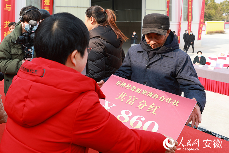 1月3日,蕪湖市灣沚區(qū)花橋鎮(zhèn)花橋村黨組織領(lǐng)辦合作社迎來首個分紅大會。在聽到自己的名字后,梅張彬美滋滋地走進(jìn)人群,數(shù)著到手的1300元現(xiàn)金,眼角都笑開了花。