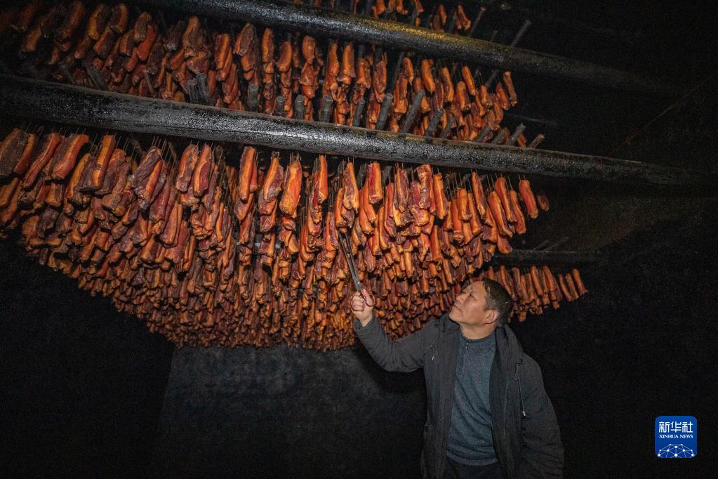 1月4日,在重慶市城口縣修齊鎮(zhèn),“城口老臘肉制作工藝”第五代傳承人趙友安在查看炕房內(nèi)臘肉的熏制情況。新華社記者 黃偉 攝
