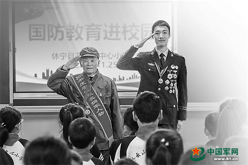 安徽省“最美擁軍人物”、退役軍人姚華亮(左敬禮者)與剛退役的二等功臣李明臣攜手走進(jìn)校園,共同開(kāi)展國(guó)防教育。黃亞明攝