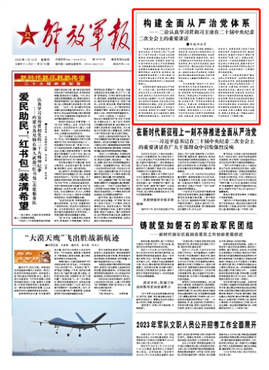 人民軍隊黨的建設(shè)是黨的建設(shè)偉大工程的重要組成部分,關(guān)系到黨的執(zhí)政地位,關(guān)系到軍隊性質(zhì)宗旨,關(guān)系到部隊?wèi)?zhàn)斗力。全軍要深入貫徹落實黨的二十大和二十屆中央紀(jì)委二次全會關(guān)于全面從嚴(yán)治黨的戰(zhàn)略部署,圍繞組織領(lǐng)導(dǎo)、體制機(jī)制、制度規(guī)范、工作推進(jìn)、措施配套和責(zé)任落實等方面,守正創(chuàng)新構(gòu)建全面從嚴(yán)治黨體系。要堅持和完善黨對軍隊的絕對領(lǐng)導(dǎo)制度,健全貫徹軍委主席負(fù)責(zé)制體制機(jī)制,推動貫徹軍委主席負(fù)責(zé)制法治化、規(guī)范化、程序化運(yùn)行,確保槍桿子永遠(yuǎn)聽黨指揮。要統(tǒng)籌加強(qiáng)我軍黨的政治建設(shè)、思想建設(shè)、組織建設(shè)、作風(fēng)建設(shè)、紀(jì)律建設(shè)等各方面制度,不斷提高黨的建設(shè)制度化、體系化、科學(xué)化水平。要建強(qiáng)人民軍隊黨的組織體系,進(jìn)一步增強(qiáng)各級黨組織的領(lǐng)導(dǎo)力、組織力、執(zhí)行力,真正把黨的政治優(yōu)勢和組織優(yōu)勢轉(zhuǎn)化為制勝優(yōu)勢,為如期實現(xiàn)建軍一百年奮斗目標(biāo)提供堅強(qiáng)思想和政治保證。