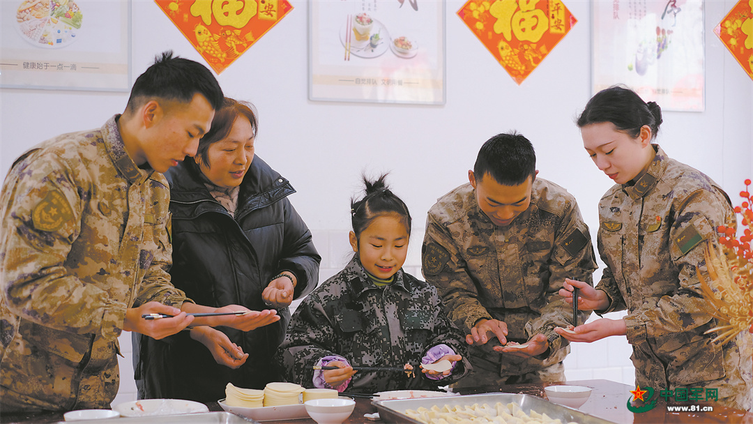 1月17日,烈士李磊的母親楊彬和妹妹易蒙莉與官兵一起包餃子。曲芳震攝