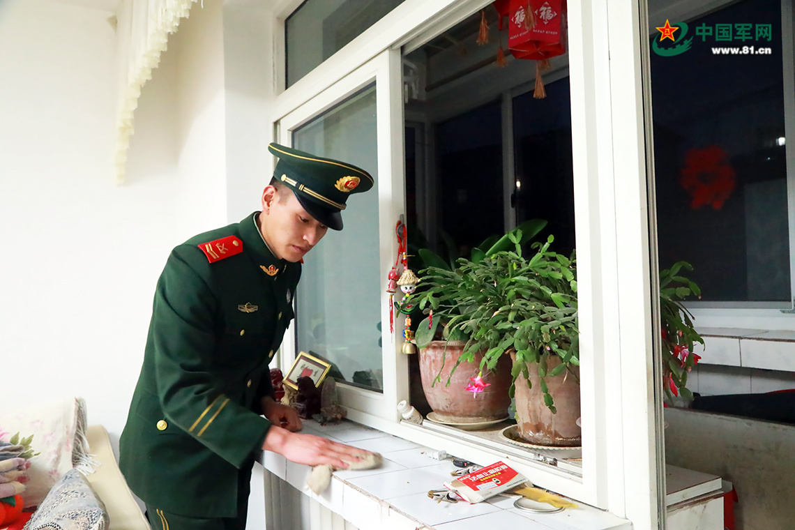 春節(jié)假期期間,空軍某部甘肅平?jīng)黾沂炕輦ゼ抑杏瓉?lái)一群特殊的人——身著橄欖綠的武警官兵?!盎輯寢?zhuān)覀冇謥?lái)看您了!”簡(jiǎn)單地打過(guò)招呼,放下帶來(lái)的慰問(wèn)品,他們就像回到自己家一樣熱火朝天地開(kāi)始打掃衛(wèi)生。窗臺(tái)、灶臺(tái)、柜頂、房頂……官兵們不放過(guò)任何一個(gè)角落。