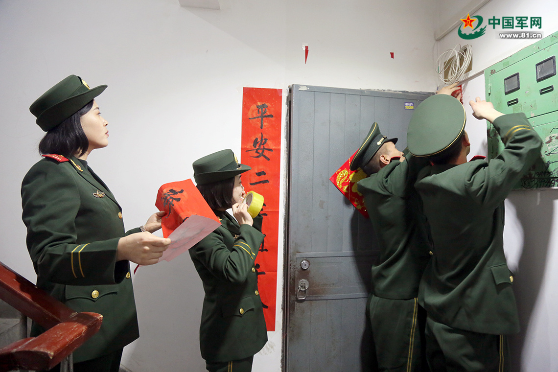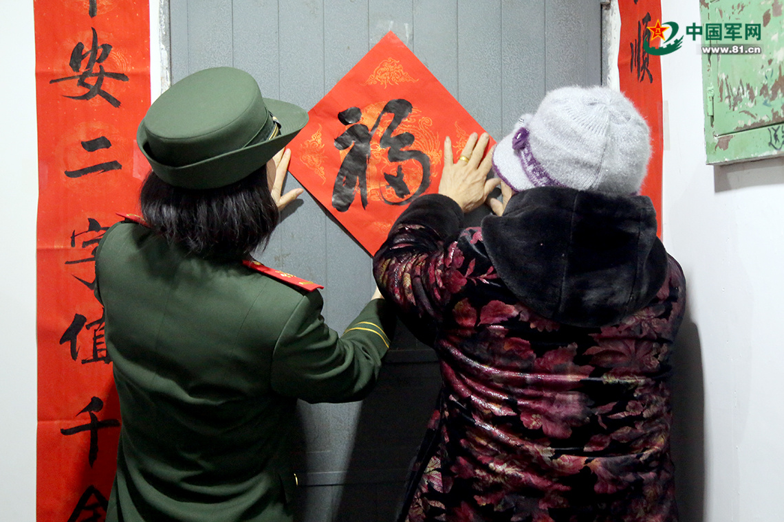 官兵和惠媽媽一起貼福字。劉偉 攝