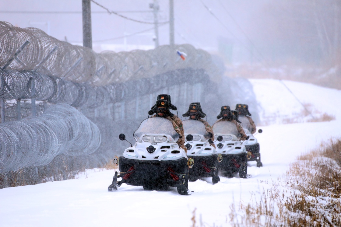 新疆阿勒泰軍分區(qū)阿黑吐拜克邊防連官兵駕駛雪地摩托在邊境一線執(zhí)行巡邏勘察任務(2022年11月20日攝)。新華社發(fā)(段偉 攝)