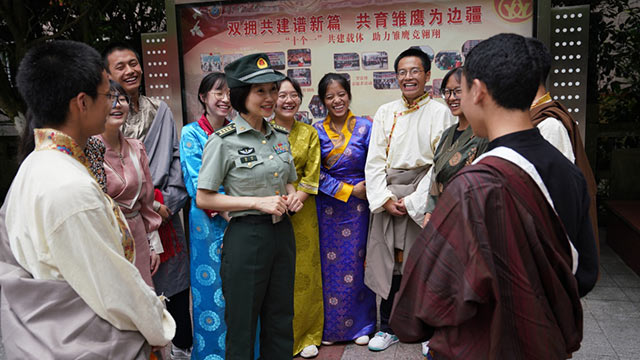 陸軍工程大學(xué)“星火”理論宣講服務(wù)政治教員群體成員秦潔(中),在重慶西藏中學(xué)與藏族學(xué)生進(jìn)行課間討論2022-11-23 10:03