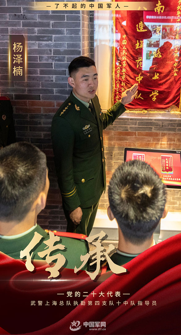 知所從來,方知所去。從1982年開始,40年來,每月20日,十中隊官兵都會在上海南京路開展為民服務(wù)活動。新時代新發(fā)展,楊澤楠帶領(lǐng)中隊官兵給“為民服務(wù)”賦予了新的內(nèi)涵。入伍15年,除了讀軍校的3年,楊澤楠的全部軍旅時光都是在十中隊度過的。“這些年,我見證了中隊的發(fā)展變化,了解中隊的優(yōu)良傳統(tǒng)、優(yōu)良作風(fēng),更清楚今天中隊該朝著什么方向去努力?!?/p>