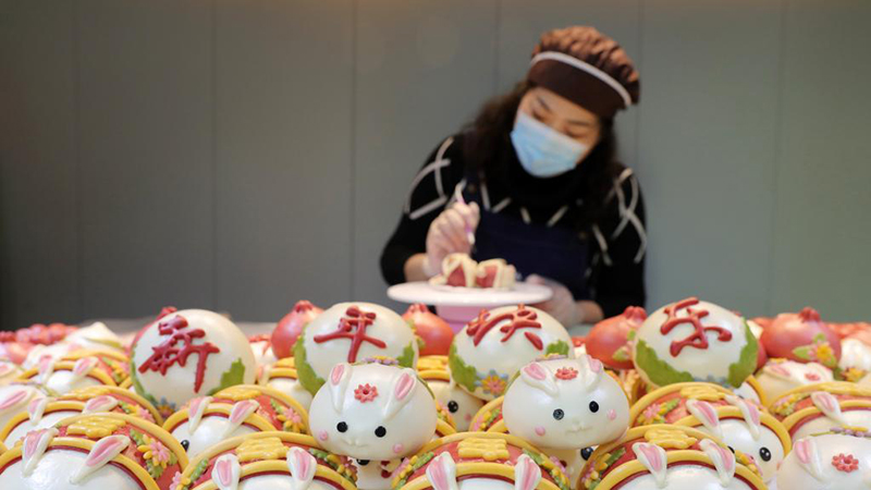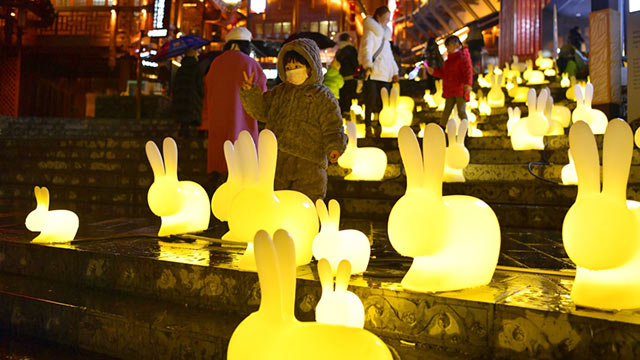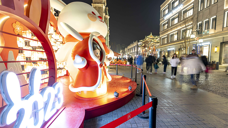 每逢夜幕降臨,鐘樓街上燈光璀璨,人頭攢動。隨處可見的新年兔子元素,為城市增添了年味,游客紛紛駐足拍照,喜氣洋洋,年味兒十足。