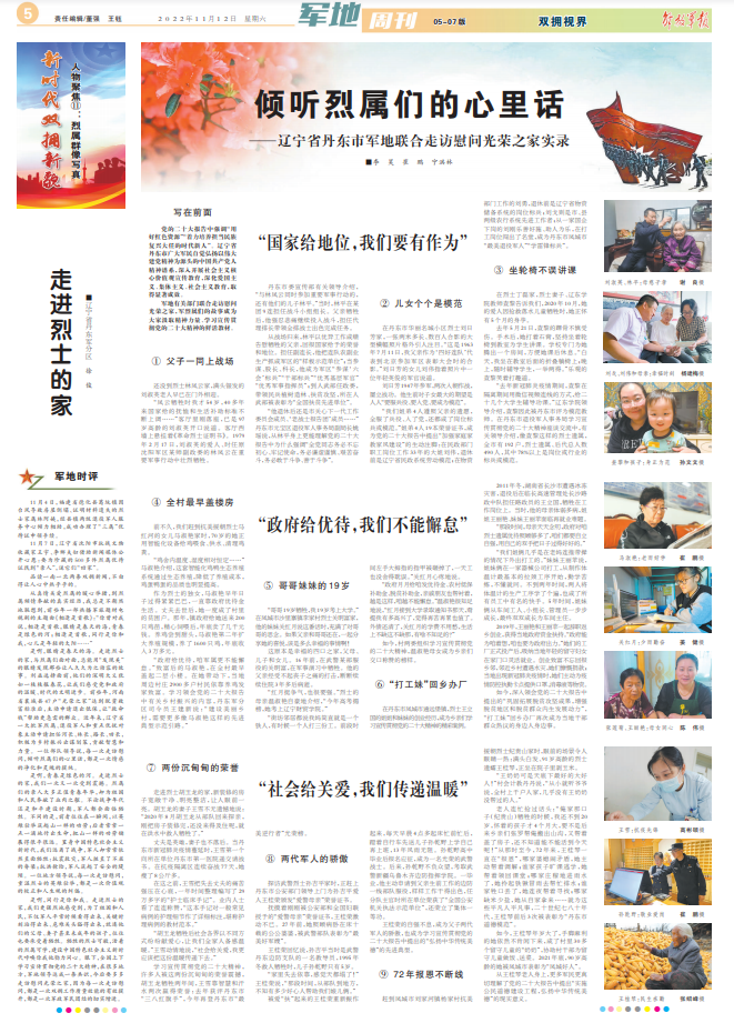 是啊,同行是你和我。走進(jìn)烈士的家,我們更強(qiáng)烈地感受到,為了祖國(guó)和人民,不僅軍人平常時(shí)候看得出來、關(guān)鍵時(shí)刻站得出來、危難關(guān)頭豁得出來,就連他們的父母、妻子甚至未成年的孩子,往往也要承受著犧牲。犧牲的烈士可敬,活著的烈屬可學(xué),建設(shè)中國(guó)特色社會(huì)主義新時(shí)代呼喚你我他勠力同心。眼下,全國(guó)上下學(xué)習(xí)宣傳貫徹黨的二十大精神,在很多地方,軍地領(lǐng)導(dǎo)達(dá)成一條共識(shí),今后要多多走訪慰問光榮之家,因?yàn)槊恳淮巫咴L慰問,都是一次雙擁工作質(zhì)量效能的有效提升,都是一次軍政軍民團(tuán)結(jié)的切實(shí)增進(jìn)。