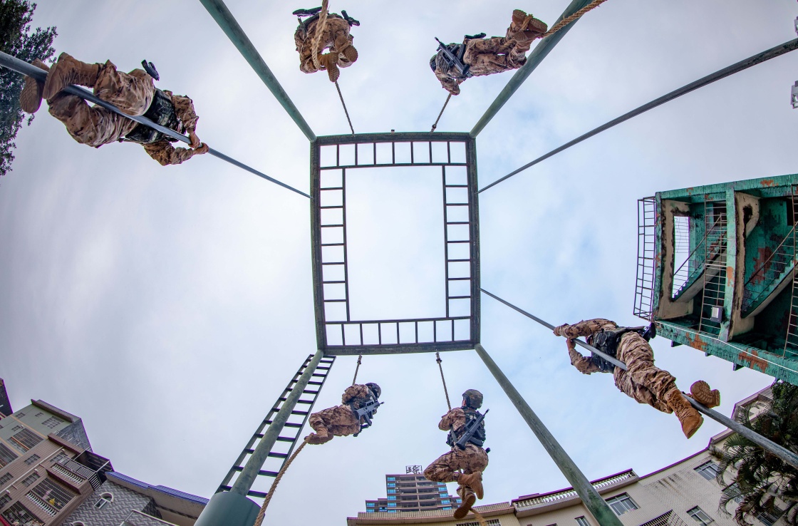 1月4日,武警廣西總隊(duì)北海支隊(duì)特戰(zhàn)隊(duì)員進(jìn)行爬繩(桿)訓(xùn)練。