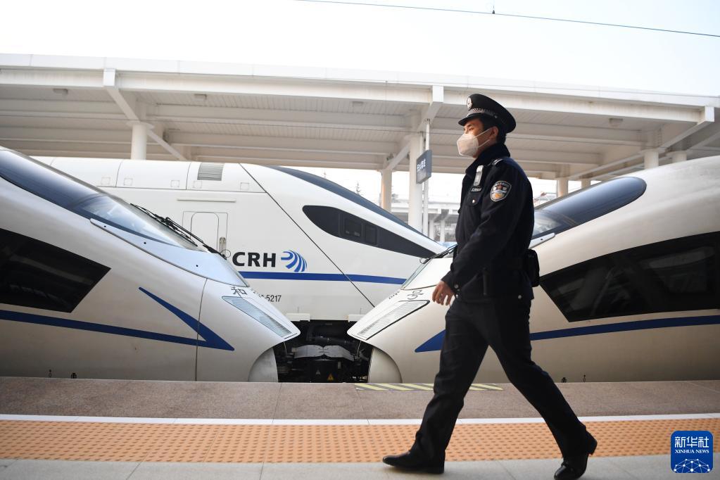 1月9日,白旭偉從G2686次動(dòng)車組列車旁走過(guò)。新華社記者 陳斌 攝