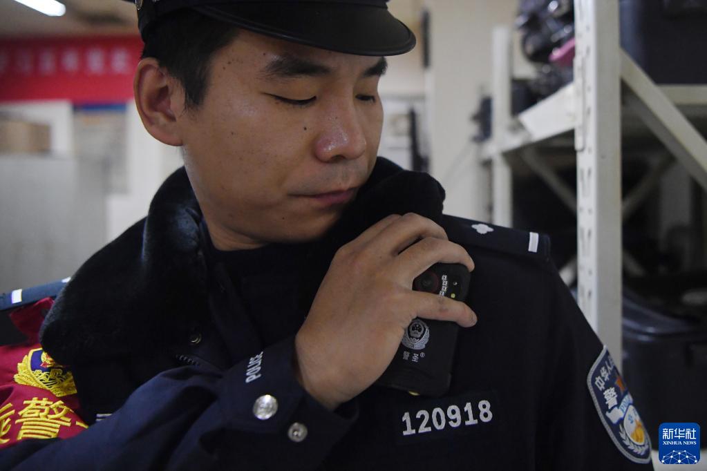 1月9日,白旭偉在值乘前檢查佩戴執(zhí)法記錄儀。新華社記者 陳斌 攝