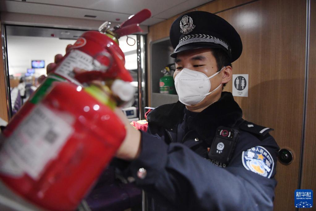 1月9日,白旭偉在G2686次動(dòng)車組列車上檢查消防器材。新華社記者 陳斌 攝
