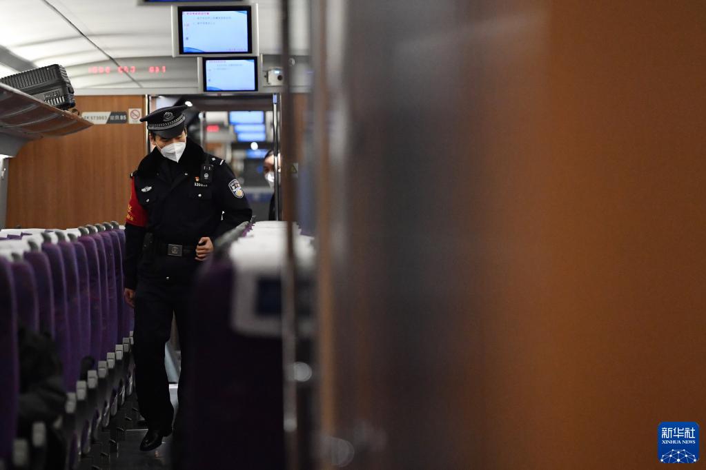 1月9日,白旭偉在G2686次動(dòng)車組列車車廂內(nèi)巡查。新華社記者 陳斌 攝