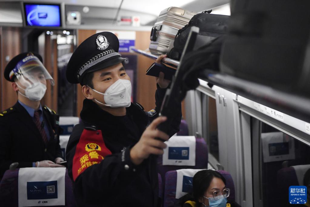 1月9日,白旭偉在G2686次動(dòng)車組列車上對(duì)旅客行李進(jìn)行安全檢查。新華社記者 陳斌 攝
