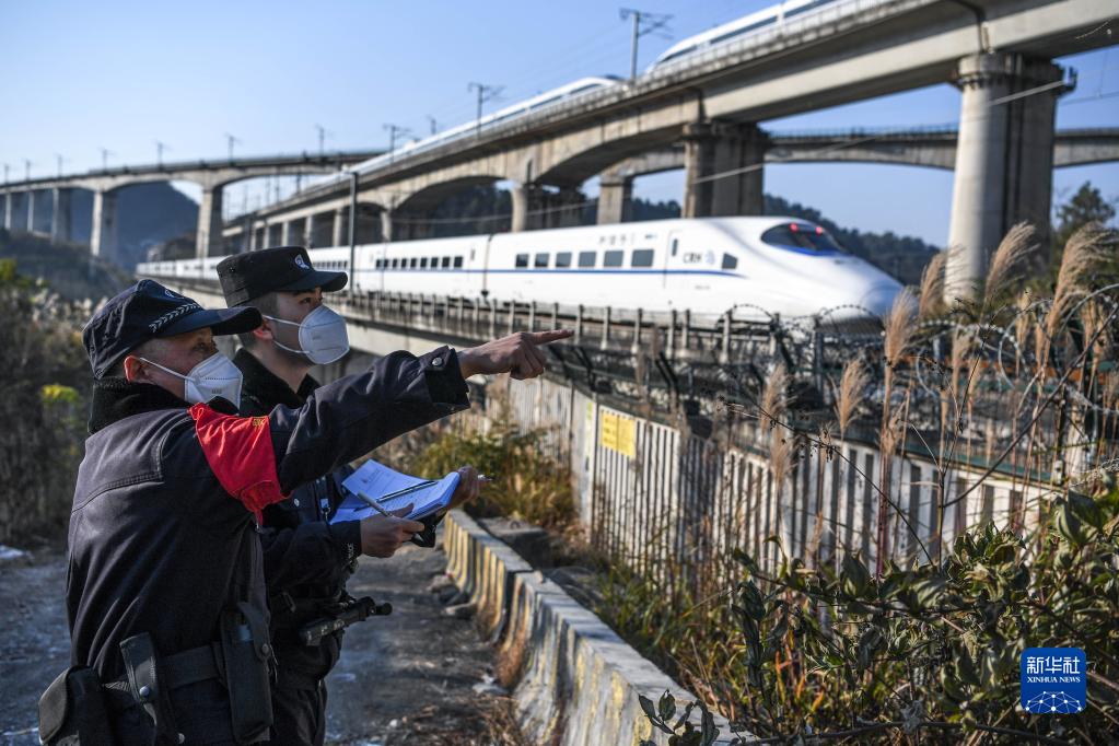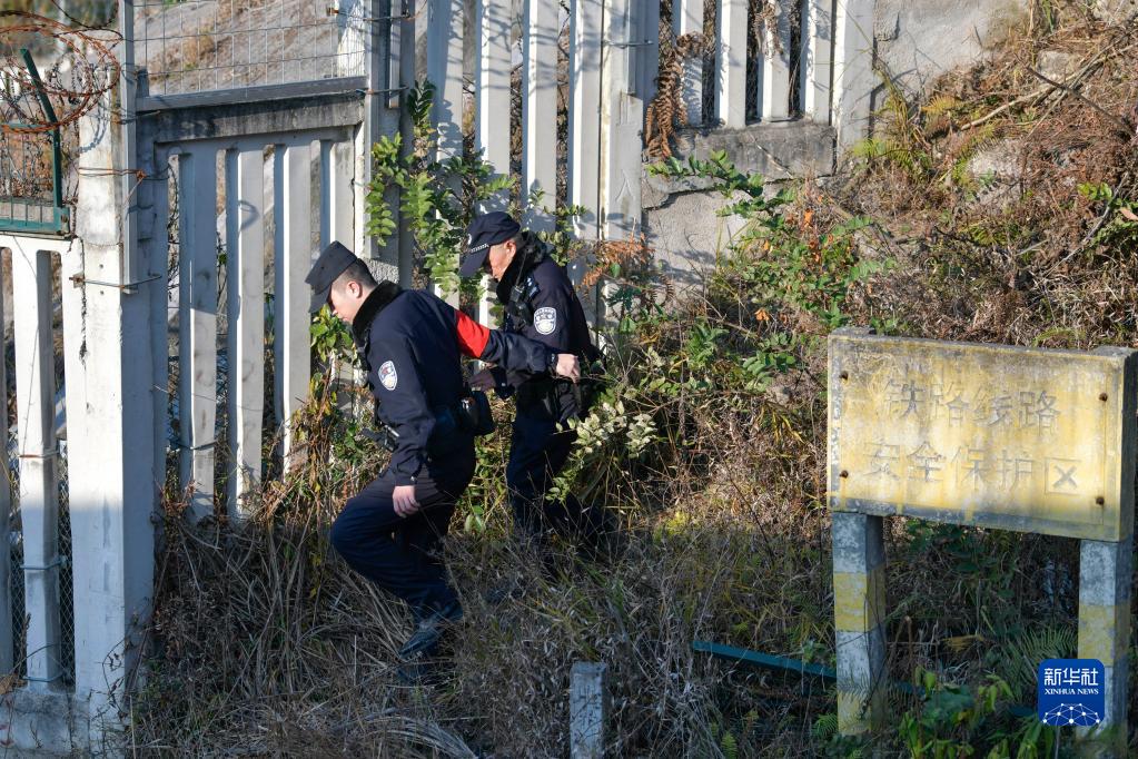 1月8日,鐵路警察王云(中)、謝源(左)與鐵路巡防員進(jìn)行線路安全巡查。新華社記者 楊文斌 攝