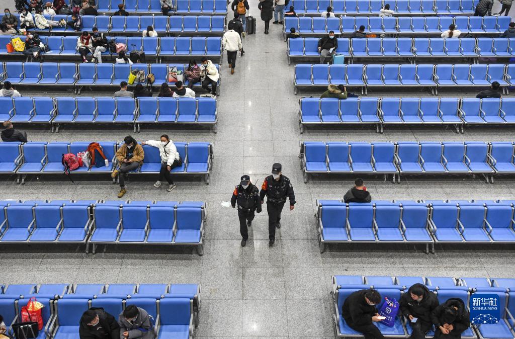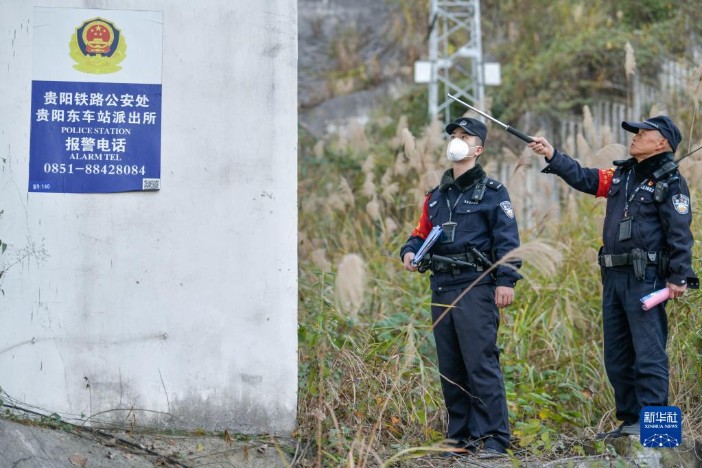 1月8日,鐵路警察王云(左)和謝源在貴陽東站候車室進(jìn)行站區(qū)巡查。新華社記者 楊文斌 攝