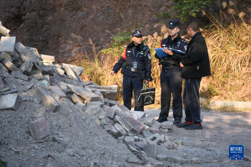 1月8日,鐵路警察王云(左)和謝源(中)對堆放建筑廢料影響鐵路橋墩穩(wěn)定的村民進(jìn)行勸導(dǎo)。新華社記者 楊文斌 攝