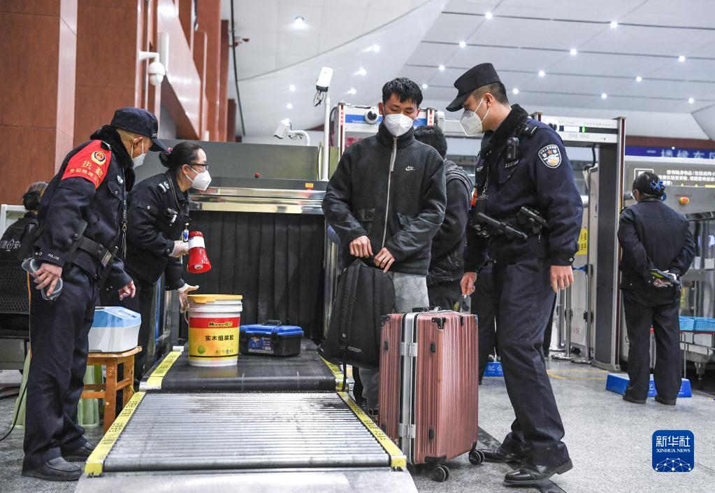 1月8日,鐵路警察王云(前左一)和謝源(前右一)在貴陽東站督導(dǎo)乘客進(jìn)站安檢情況。新華社記者 楊文斌 攝