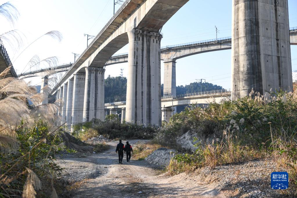 1月8日,鐵路警察王云(右)和謝源在鐵路沿線進(jìn)行線路安全巡查。新華社記者 楊文斌 攝