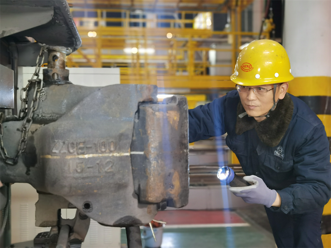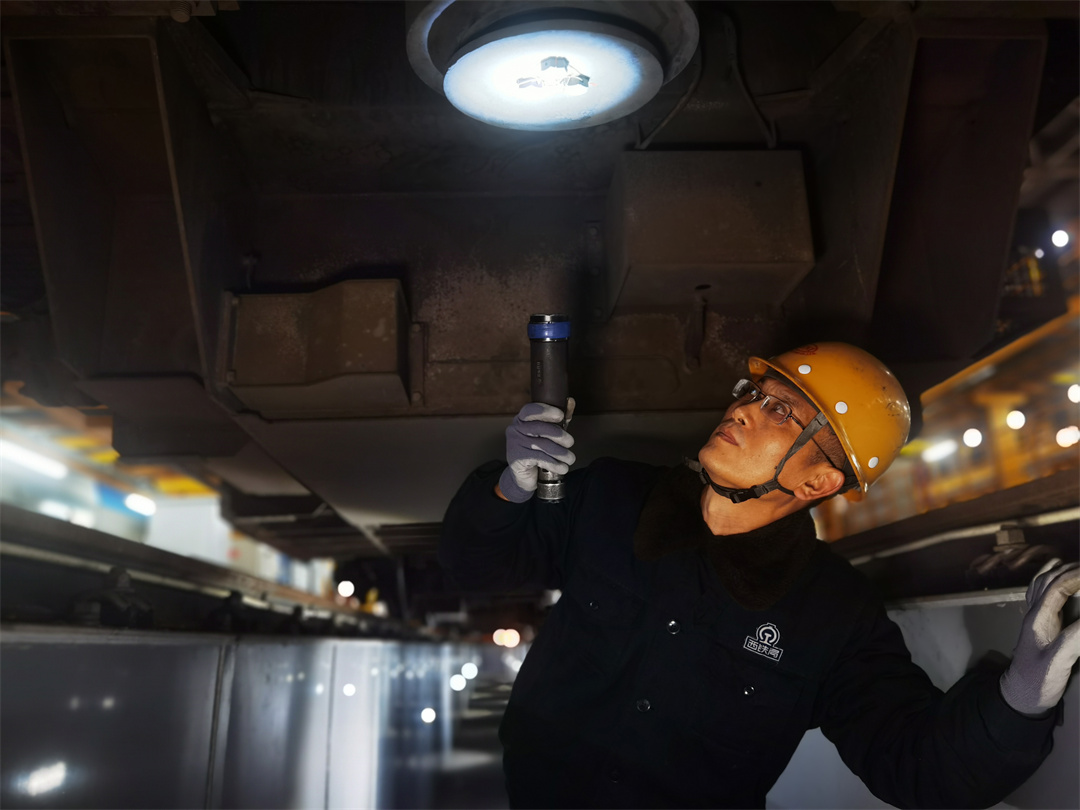 51歲的曹壯,頭戴黃色安全帽,手持?jǐn)z像手電,眼神正追隨手電的光束,一寸一寸掃描機(jī)車走行部每一個(gè)零部件。