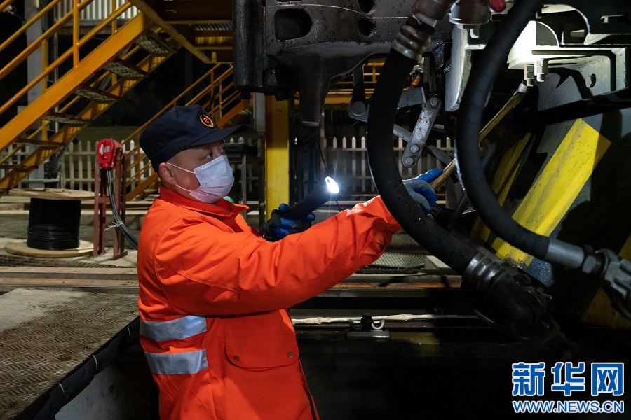 王德軍正在對機(jī)車進(jìn)行檢修。新華網(wǎng)發(fā) 趙磊 攝