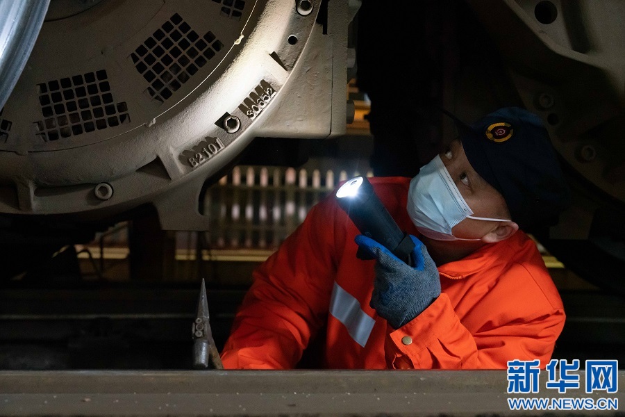 王德軍正在對機(jī)車走行部進(jìn)行檢修。新華網(wǎng)發(fā) 趙磊 攝