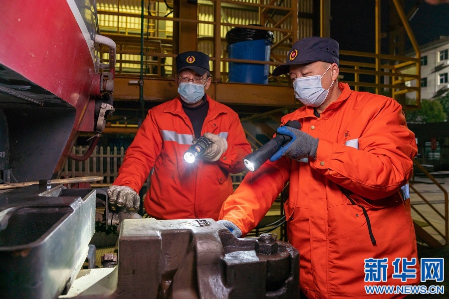 王德華、王德軍兩兄弟正在對機(jī)車車鉤進(jìn)行檢修。新華網(wǎng)發(fā) 趙磊 攝